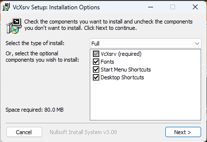 - 다운로드한 설치 프로그램을 더블클릭해서 ‘VcXsrv’ 프로그램을 설치합니다.