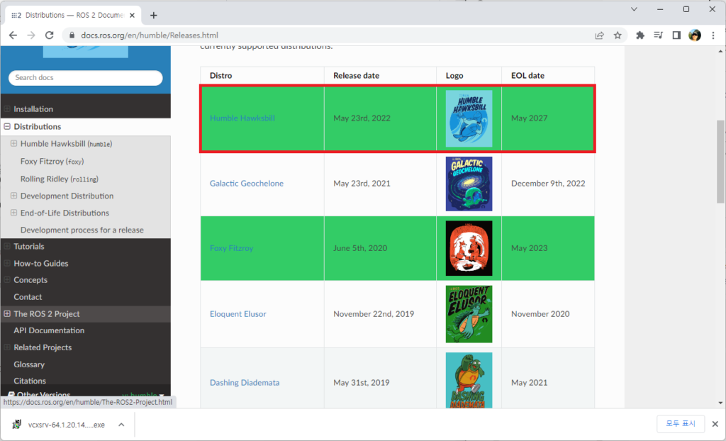 - ROS2 Humble Distributions 사이트에 접속하면 다운로드 가능한 ROS2 버전을 확인할 수 있습니다. 현재 기준 가장 최신 버전인 Humble을 설치하겠습니다.