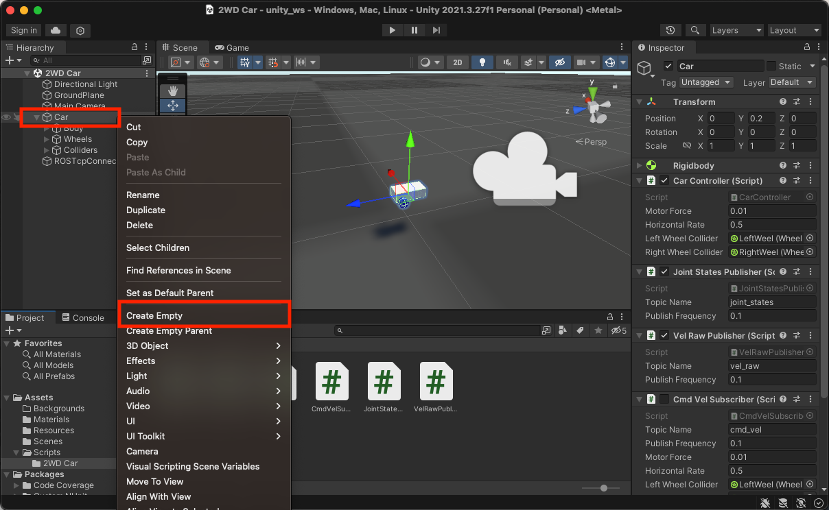 이번 포스팅은 URDF를 이용해 만든 로봇에 Unity 자동차 연결하기 (3) 과정을 통해서 만들어진 Unity 로봇에 카메라를 부착하고 ROS와 연동해 보는 과정입니다. 이 포스트는 다음 과정을 완료한 후에 참고하시길 바랍니다. URDF를 이용한 간단한 로봇 만들기 (1) URDF를 이용한 간단한 로봇 만들기 (2) URDF를 이용한 간단한 로봇 만들기 (3) URDF를 이용해 만든 로봇에 가상 자동차 연결하기 (1) URDF를 이용해 만든 로봇에 가상 자동차 연결하기 (2) URDF를 이용해 만든 로봇에 Unity 자동차 연결하기 (1) URDF를 이용해 만든 로봇에 Unity 자동차 연결하기 (2) URDF를 이용해 만든 로봇에 Unity 자동차 연결하기 (3) 1. Unity 로봇에 카메라 부착하..