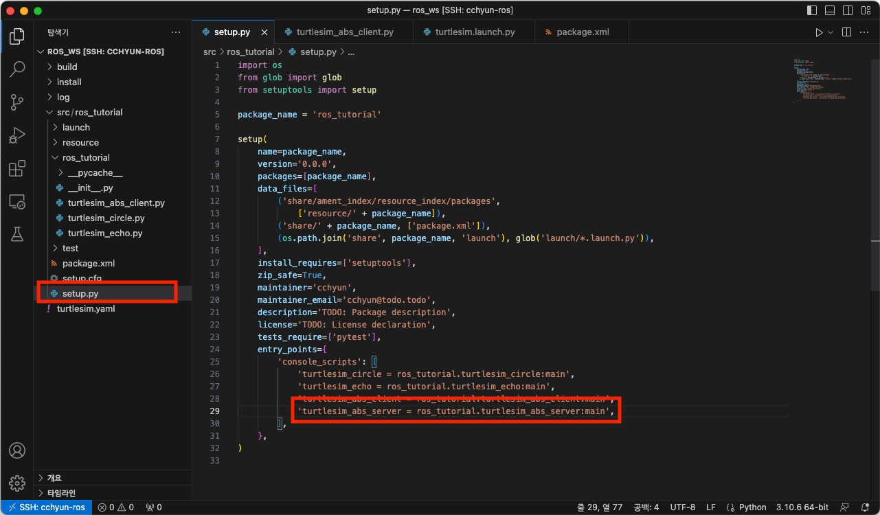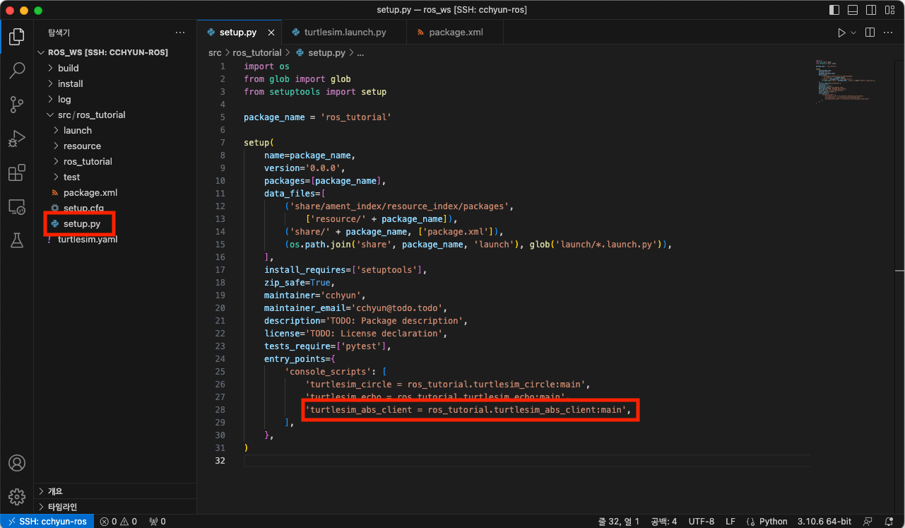 - 'src/ros_tutorial/setup.py'의 'console_scripts' 부분에 아래 내용을 추가합니다. 아래 그림과 같이 'turtlesim_abs_client'이라는 명령을 등록했습니다.