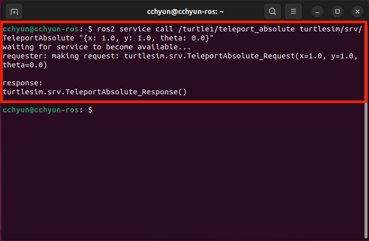 $ ros2 service call /turtle1/teleport_absolute turtlesim/srv/TeleportAbsolute "{x: 1.0, y: 1.0, theta: 0.0}"