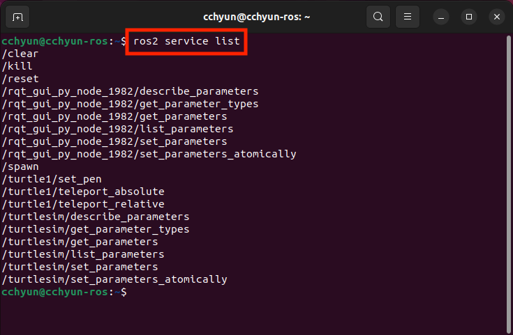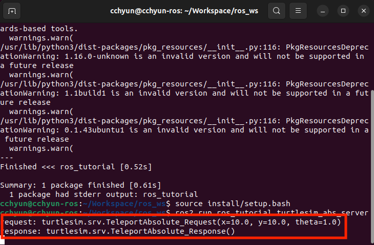 - 'turtlesim_abs_server'가 실행중인 첫 번째 터미널에 'turtlesim_abs_client'가 보낸 메시지가 출력되는 것을 확인할 수 있습니다.