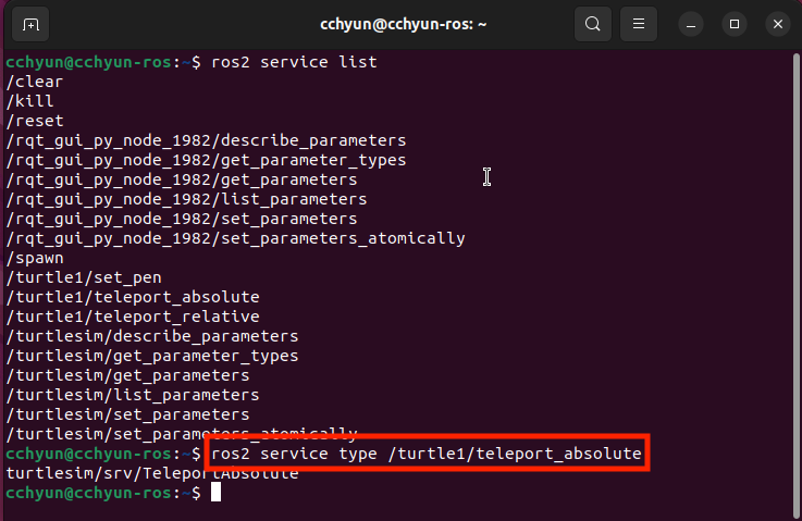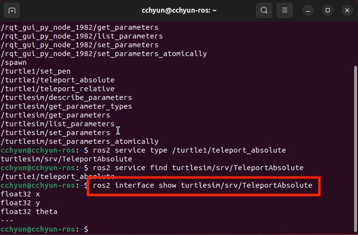 - 아래 명령을 실행해서 '/turtle1/teleport_absolute' Service에 전달할 메시지를 확인합니다. 아래 그림과 같이 'turtlesim/srv/TeleportAbsolute'라는 메시지를 주고받는 것을 확인할 수 있습니다.