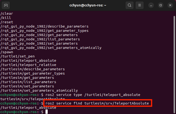 $ ros2 service find turtlesim/srv/TeleportAbsolute