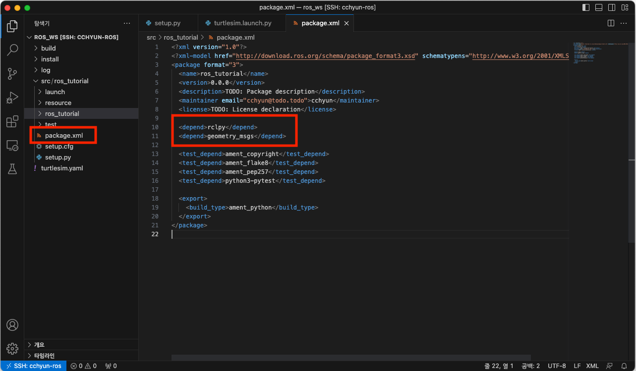 - 'src/ros_tutorial/package.xml' 파일을 아래와 같이 수정합니다. 아래 그림과 같이 Publisher가 사용할 dependency를 추가했습니다.