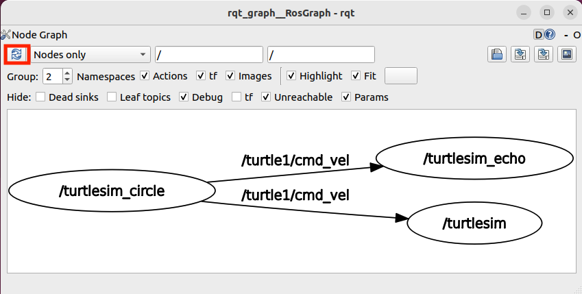 - rqt_graph 창의 '새로고침' 버튼을 누르면 '/turtlesim_circle' Node에서 '/turtlesim' Node와 '/turtlesim_echo' Node로 '/turtle1/cmd_vel' Topic을 발송하는 것을 확인할 수 있습니다.