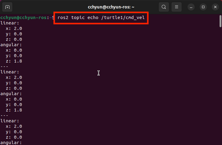 $ ros2 topic echo /turtle1/cmd_vel