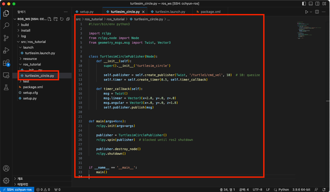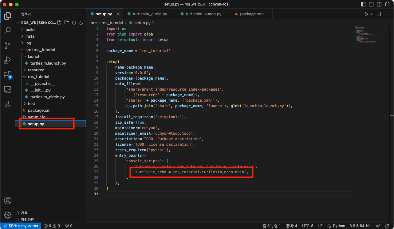 - 'src/ros_tutorial/setup.py'를 아래와 같이 수정합니다. 아래 그림과 같이 'turtlesim_circle'이라는 명령을 등록했습니다.
