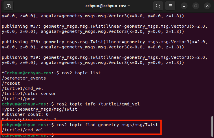- 아래 명령을 실행해서 'geometry_msgs/msg/Twist'를 사용하는 모든 Topic을 찾을 수 있습니다.