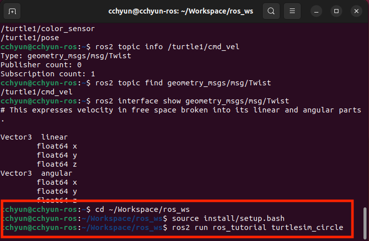 $ ros2 run ros_tutorial turtlesim_circle