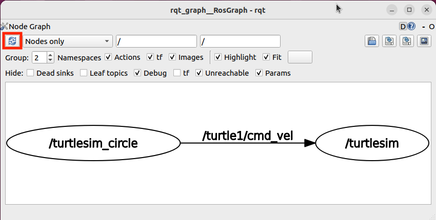 - rqt_graph 창의 '새로고침' 버튼을 누르면 '/turtlesim_circle' Node에서 '/turtlesim' Node로 '/turtle1/cmd_vel' Topic을 발송하는 것을 확인할 수 있습니다.
