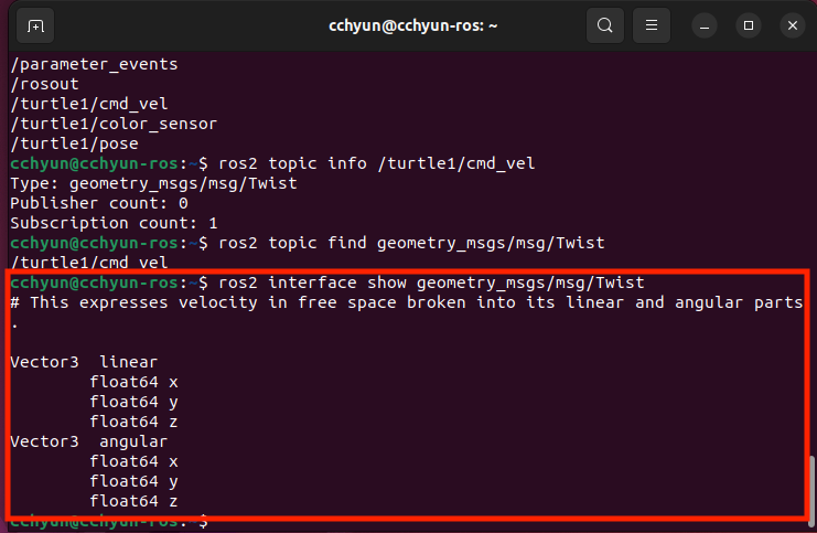 - 아래 명령을 실행해서 '/turtle1/cmd_vel'의 상세 정보를 확인합니다. 아래와 같은 정보를 확인할 수 있습니다.