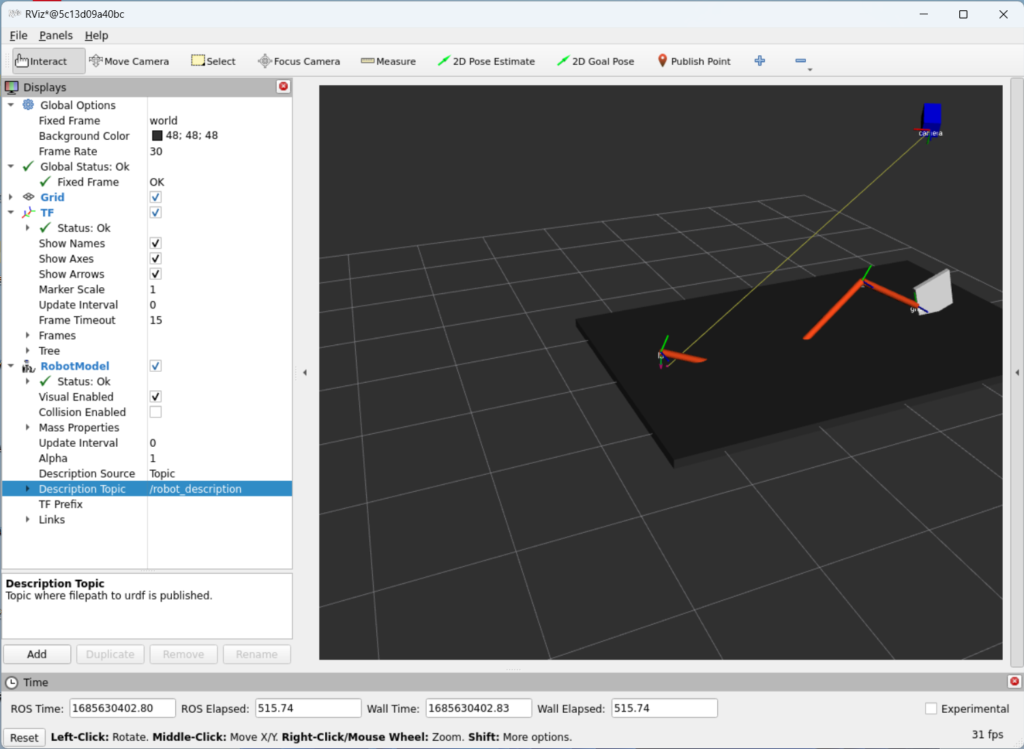 - 실행된 Rviz 창에서 ‘Fixed Frame’에서 ‘world’를 선택합니다.