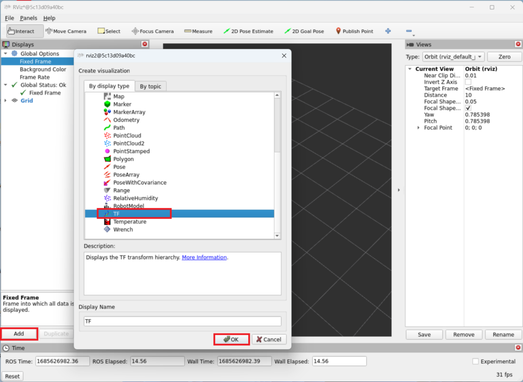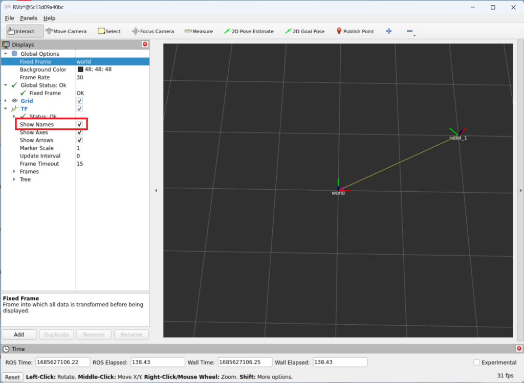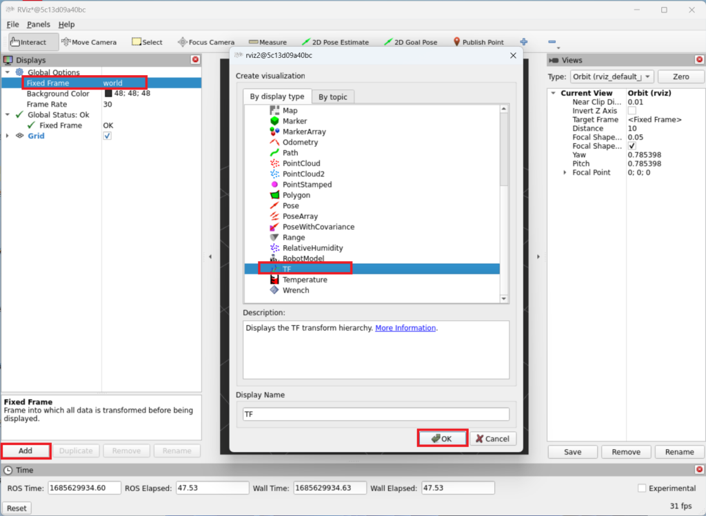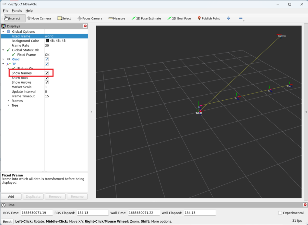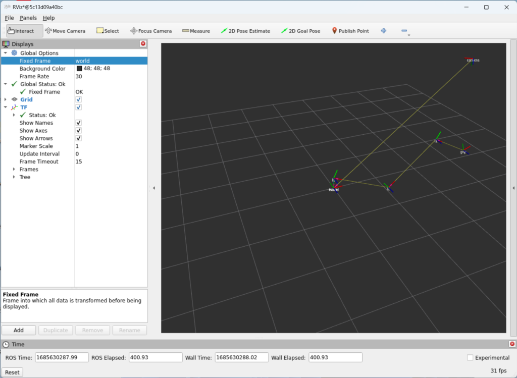 - Rviz 창에서 ‘Fixed Frame’을 ‘world’를 선택하고 TF를 추가합니다.