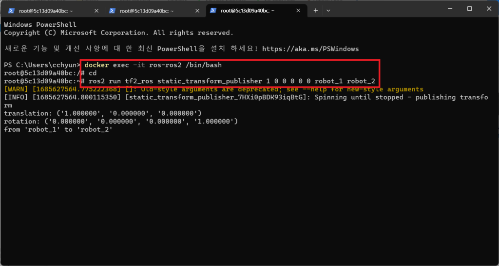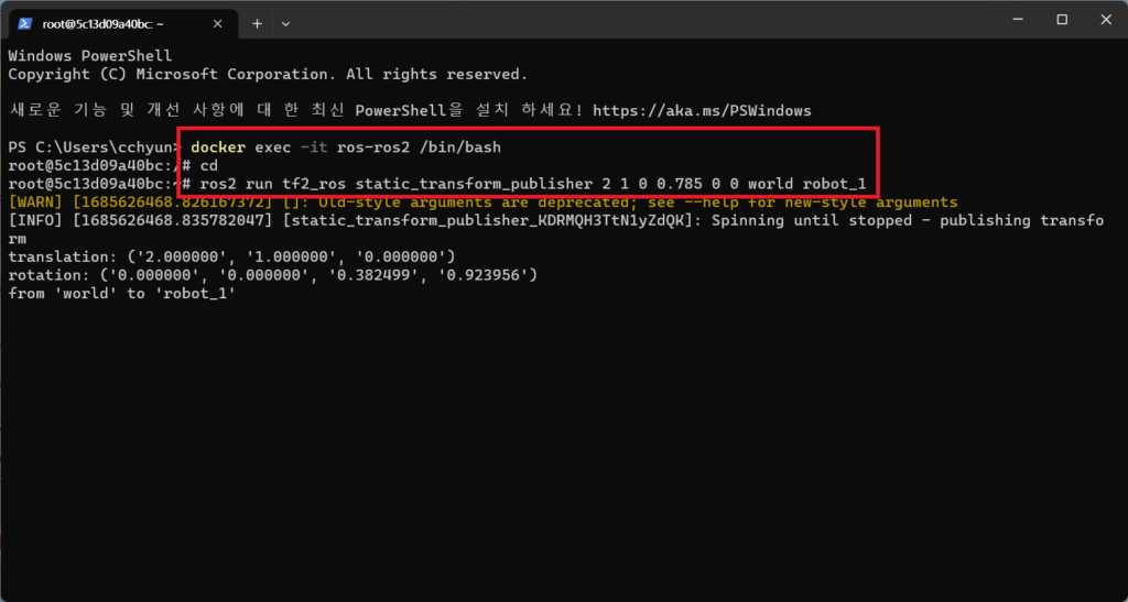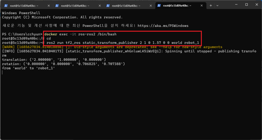 $ ros2 run tf2_ros static_transform_publisher 2 1 0 0.785 0 0 world robot_1