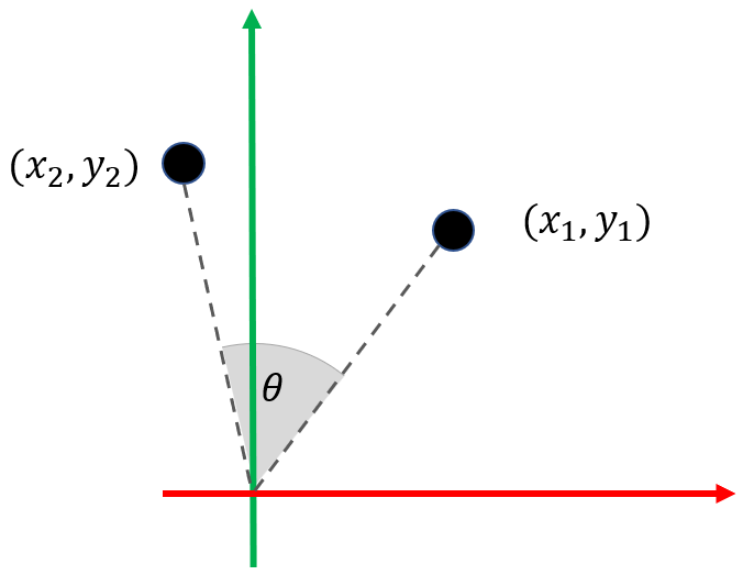 - 아래 그림과 같이 $(x_1, y_1)$ 좌표를 $\theta$ 만큼 회전한 점의 좌표를 구하는 회전 변환 행렬은 다음과 같습니다.