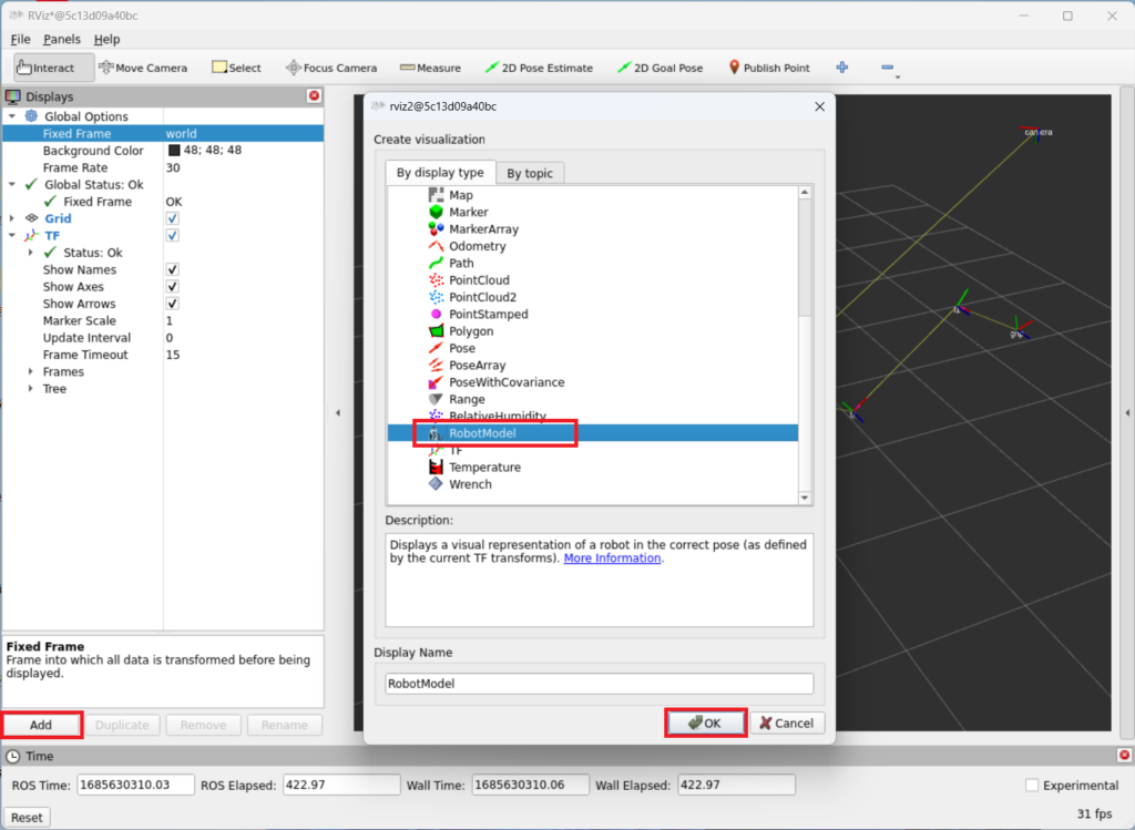 - Rviz에 ‘Robot Model’을 추가합니다.