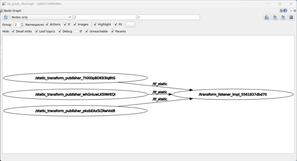 $ ros2 run tf2_ros static_transform_publisher 1 0 0 0 0 0 robot_1 robot_2