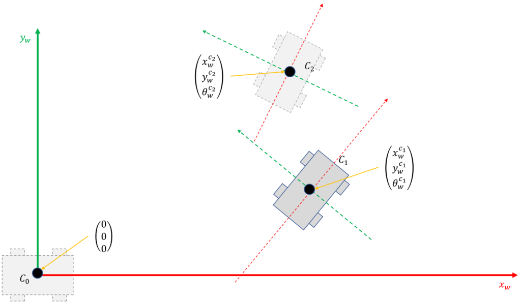 - $C_0$에서 $C_1$으로 이동하기 위해서는 로봇에게 $(x_w^{c_1}), y_w^{c_1}), \theta_w^{c_1})$으로 이동하라고 명령하면 됩니다. 이유는 로봇이 사용하는 좌표와 우리가 사용하는 좌표 (world)가 같이 때문입니다.