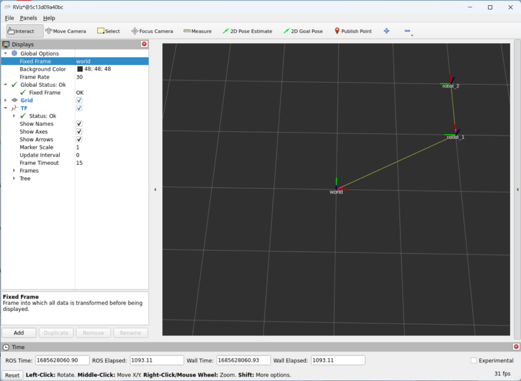- Rviz에서 확인하면 ‘robot_1’의 좌표를 기준으로 ‘robot_2’가 $(x, y, \theta) = (1, 0, 0)$ 위치에 나타난 것을 확인할 수 있습니다.